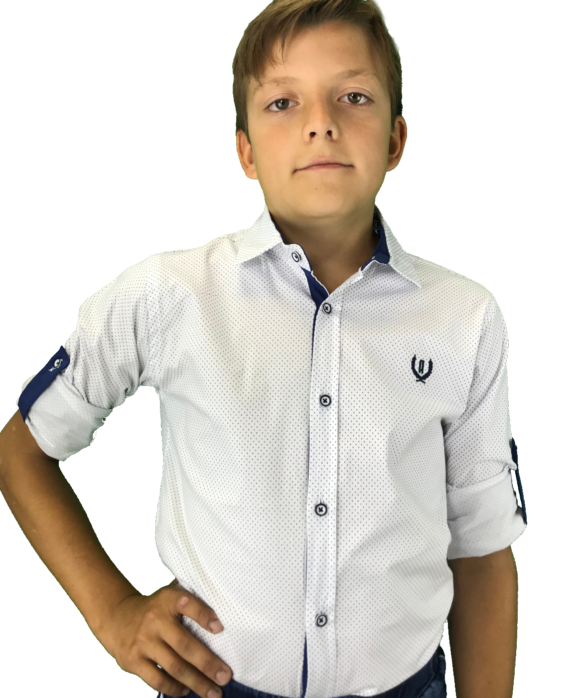 Приталенная рубашка. Спереди вышит фирменный логотип. Отличный вариант для школы.